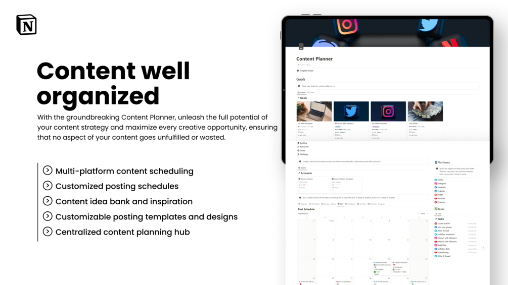 - Comprehensive Platform: Plan, write, and organize your content effortlessly across multiple social media platforms. From Twitter to Facebook, Instagram to Reddit, YouTube to LinkedIn, and Pinterest, this template supports them all in one centralized location.