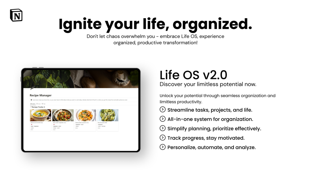 Life OS helps you to be constantly organized. Whether it's your projects, your tasks, your recipes, goals, or your bucket list. Every workspace is organized and designed to minimize your stress. As long as you organize your life in the Life OS and write down everything that's bothering you, your stress will disappear.