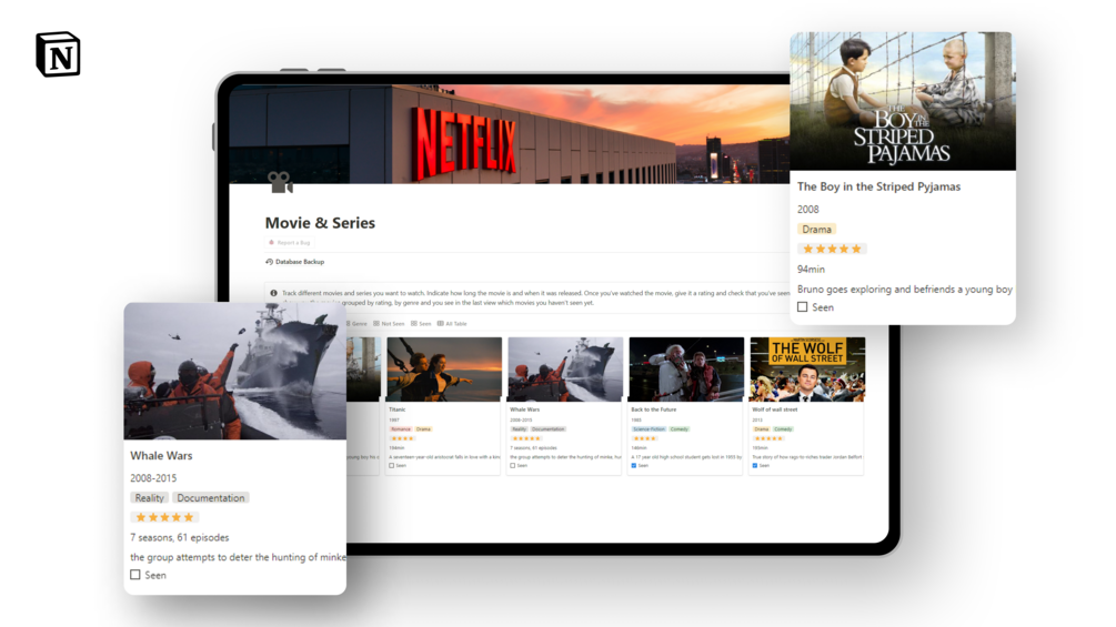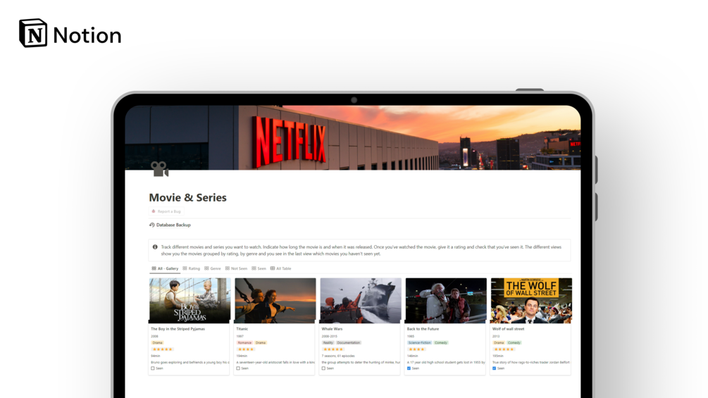Experience the satisfaction of a neatly organized movie and series tracking system. With this template, you can streamline your entertainment journey, manage your watchlist effortlessly, and relish in the pleasure of staying connected to the movies and series you love. Start using this user-friendly template today and embrace the joy of organized movie and series tracking.