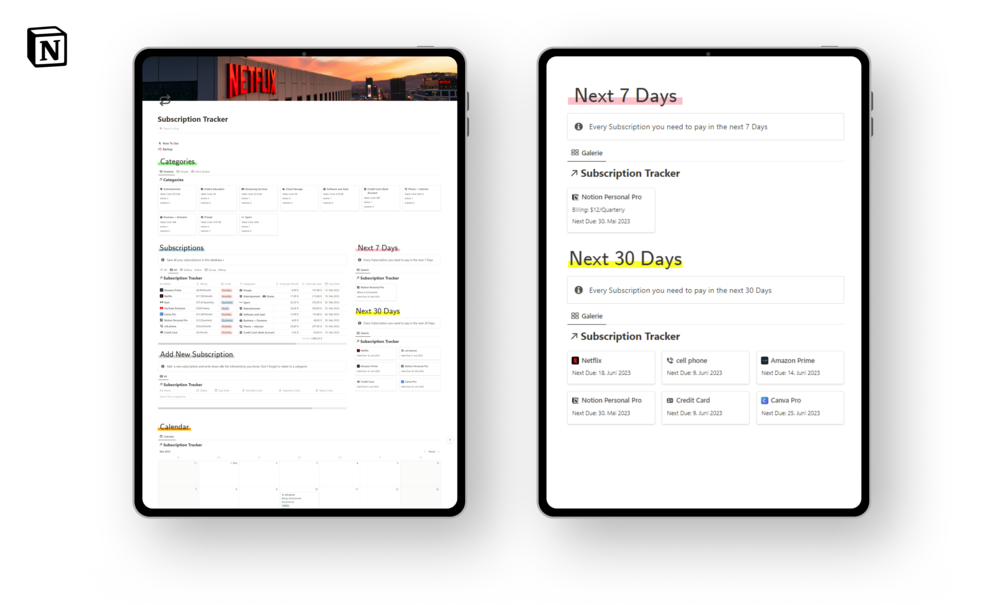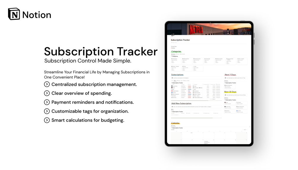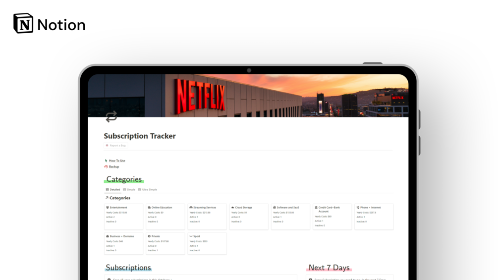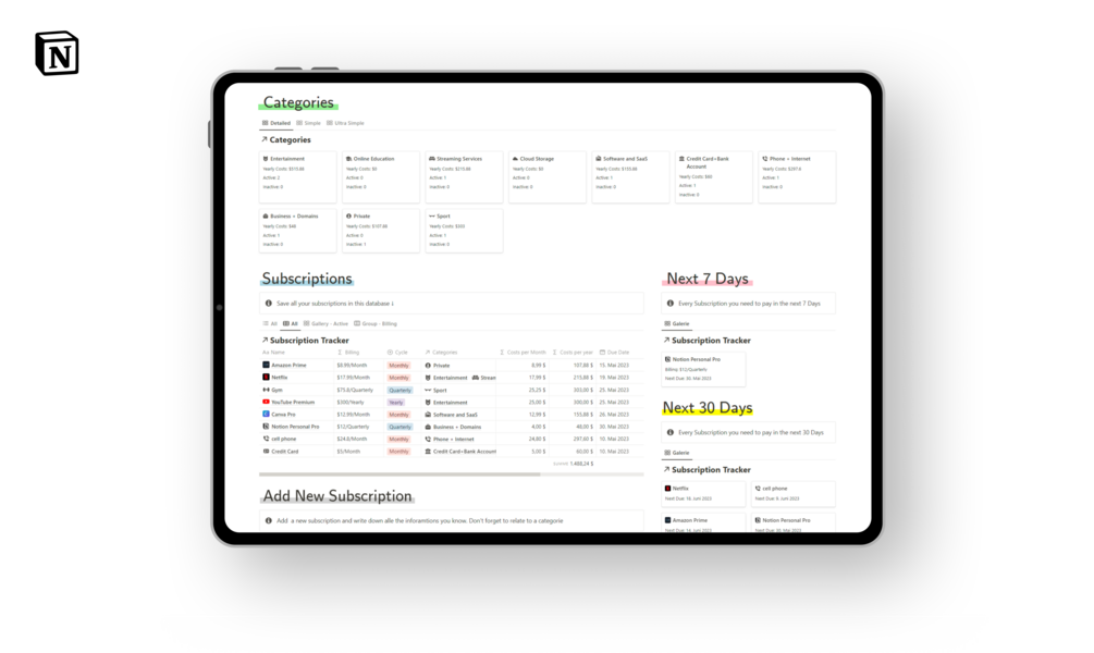 The Subscription Tracker is your go-to solution for effortlessly managing all your subscriptions in one convenient place. Designed with simplicity and effectiveness in mind, this tool eliminates the hassle of scattered information and complex systems. Take control of your subscriptions and unlock a world of financial organization.